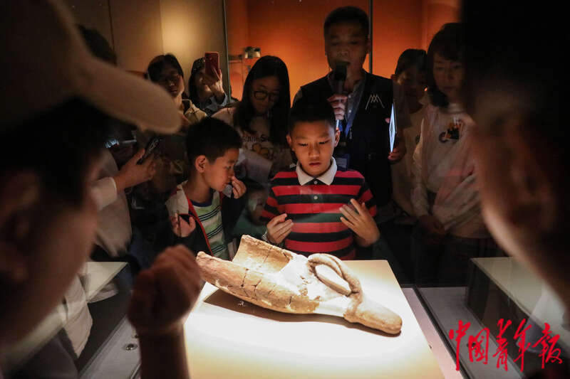 9月28日,北京民生美术馆,几名小观众在观看一只出土自甘肃秦安大地湾遗址的新石器时代箕形陶器。中青报·中青网记者 孔斯琪/摄