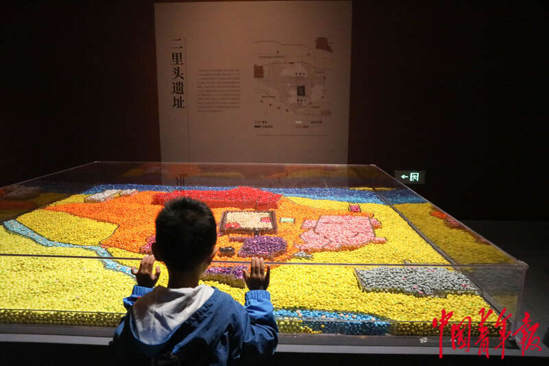 9月28日,北京民生美术馆,一名小朋友在观看用不同颜色糖豆拼成的二里头遗址复原图。中青报·中青网记者 孔斯琪/摄