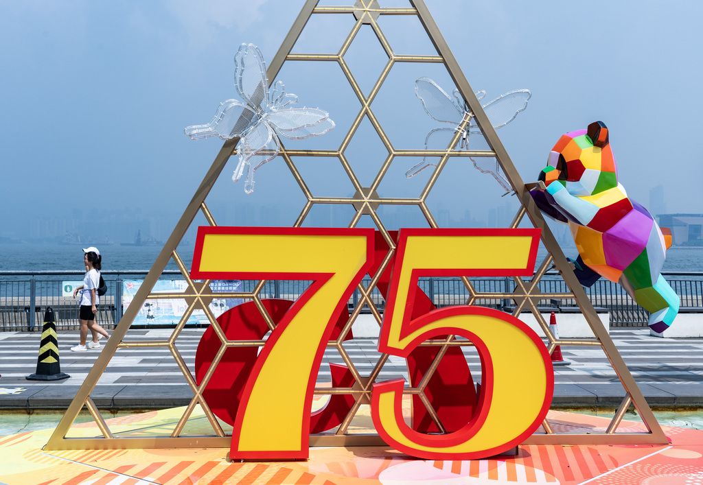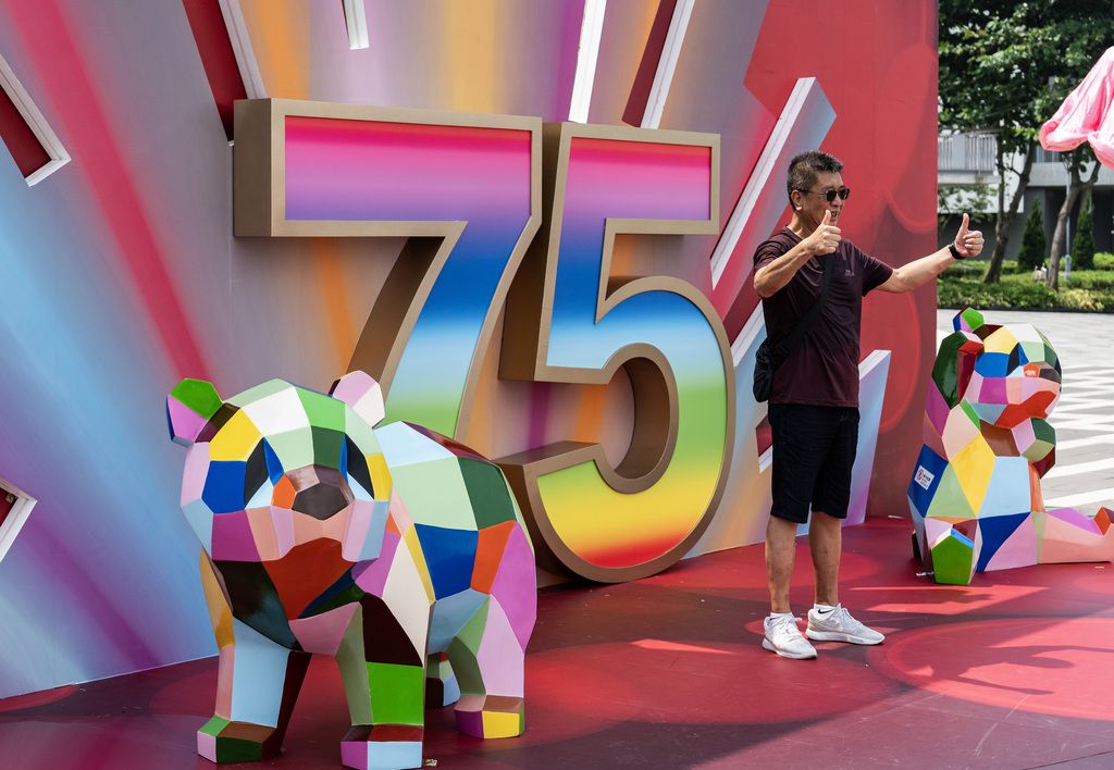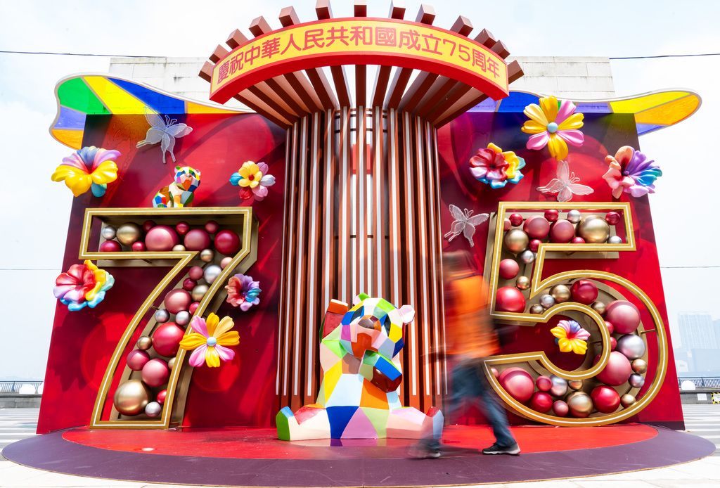 9月28日,位于香港上环的中山纪念公园内,市民途经带有大熊猫元素的庆祝新中国成立75周年装饰布景。9月26日,第三对中央政府赠送香港特区的大熊猫已顺利抵达香港海洋公园。 中新社记者 侯宇 摄