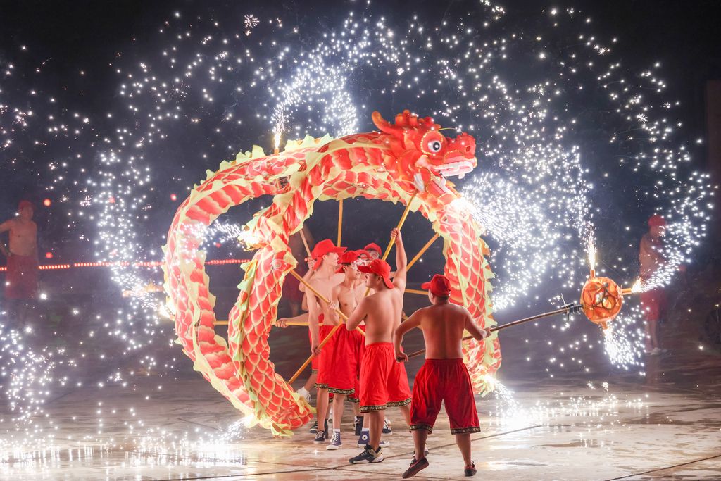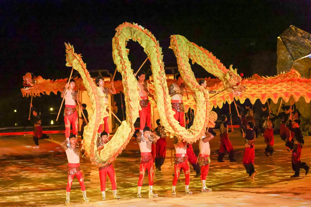 2024年9月27日晚,重庆,大型非遗山水实景剧《追梦·铜梁龙》在重庆市铜梁区玄天湖龙文化演艺中心上演。该剧讲述了一条小鲤鱼坚守初心,克服困难,并最终跃过龙门化身神龙的故事。演出以巴岳山为天然背景、玄天湖为广阔舞台,运用现代科技手段,将铜梁龙舞、铜梁龙灯彩扎两项国家级非遗元素与现代叙事完美融合,推动了铜梁龙文化创造性转化、创新性发展。 中新社记者 贾天勇 摄