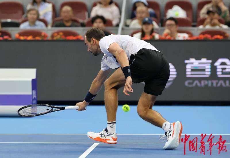 9月28日,北京,国家网球中心,2024中国网球公开赛男子单打第二轮,俄罗斯选手萨菲乌林在比赛中救球。中青报•中青网记者 曲俊燕/摄