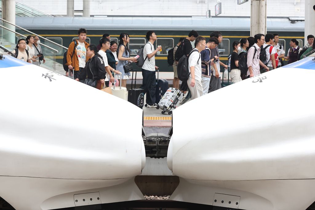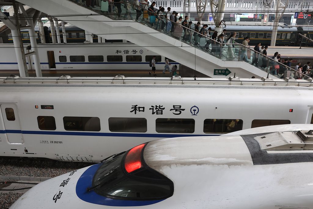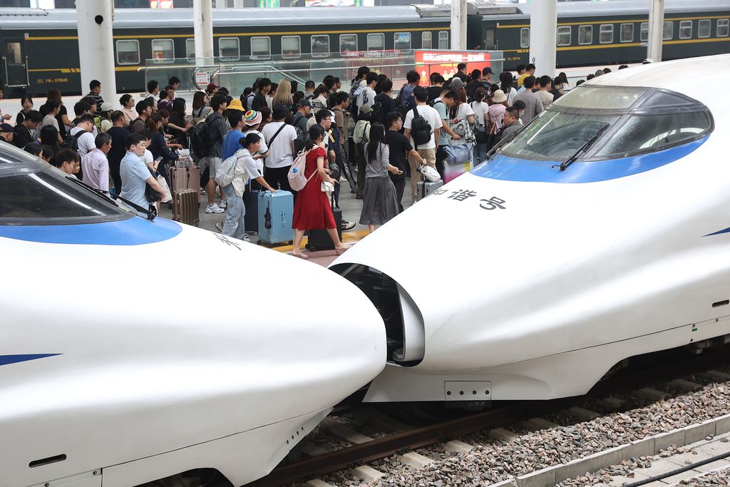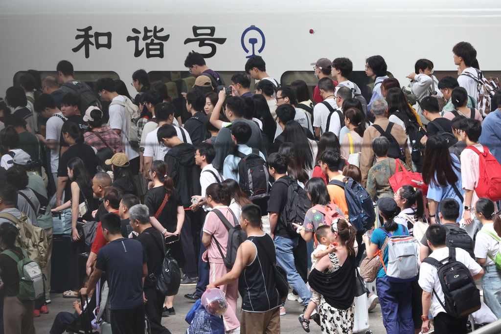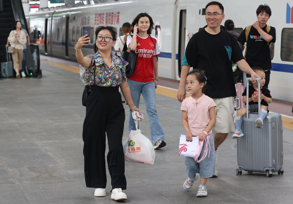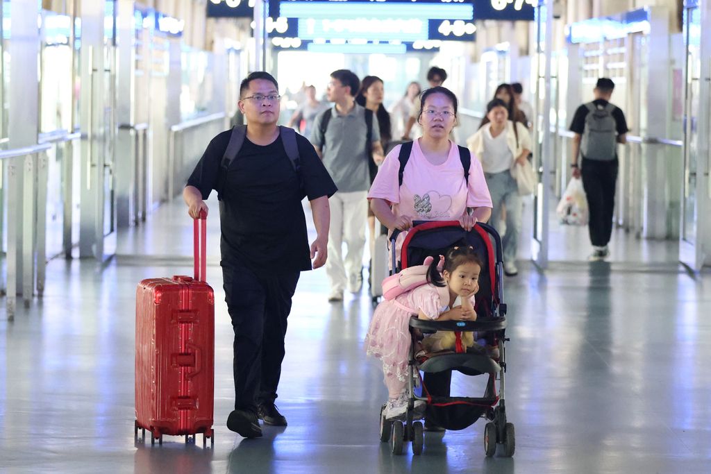 2024年9月30日,江苏南京,旅客们在火车站出行。当日,长三角铁路迎来国庆黄金周节前出行大客流,预计发送旅客338万人次,对客流饱满方向增开467列旅客列车满足高峰客流出行需要。铁路国庆黄金周运输自9月29日开始,至10月8日结束,为期10天。 中新社记者 泱波 摄