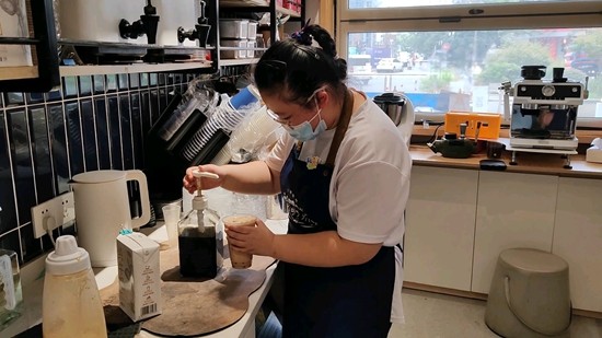 记住并熟练操作制作奶茶的过程,对于心智障碍青年来说并不容易。患有智力障碍的亦璇经常会忘记一些制作步骤。茶饮铺的辅导员老师会不厌其烦地教导她,提醒她不要着急。“进入工作台的第一件事是什么?看看脸上是不是有什么没戴上的?”通过这样的方式帮助她回忆起制作步骤。