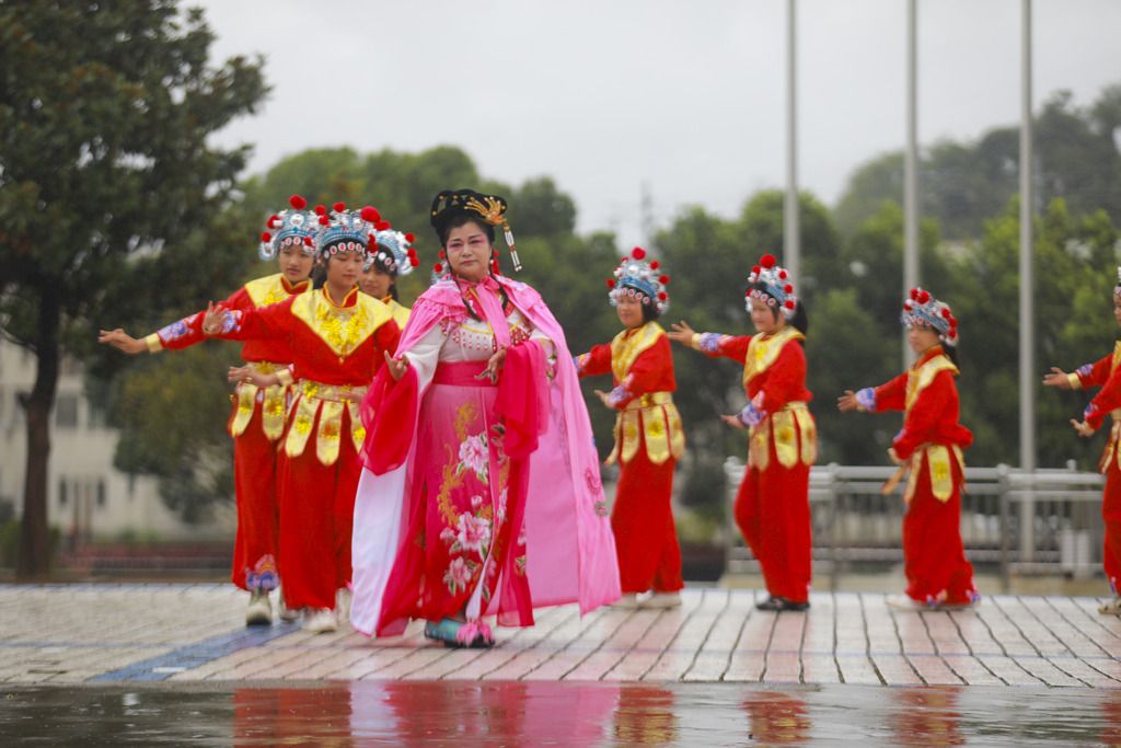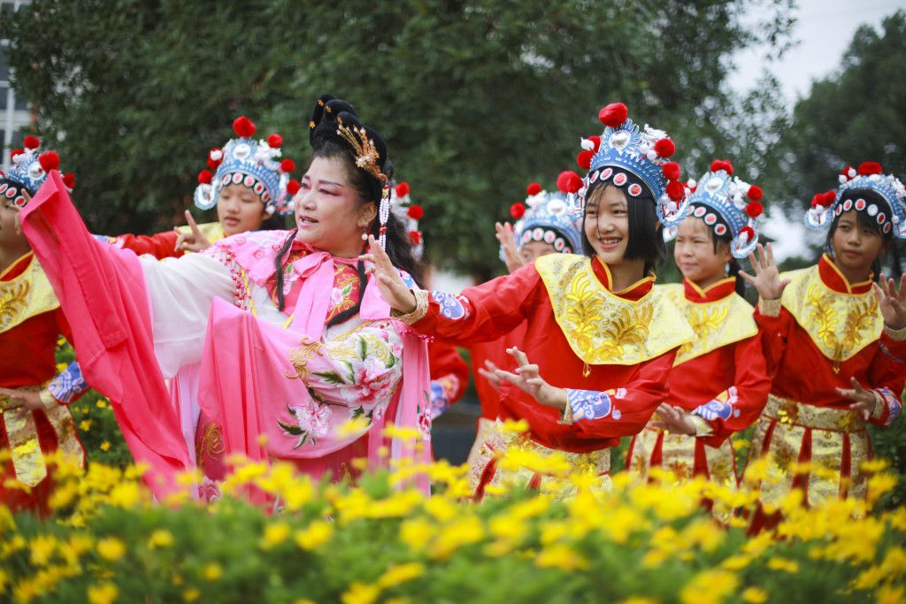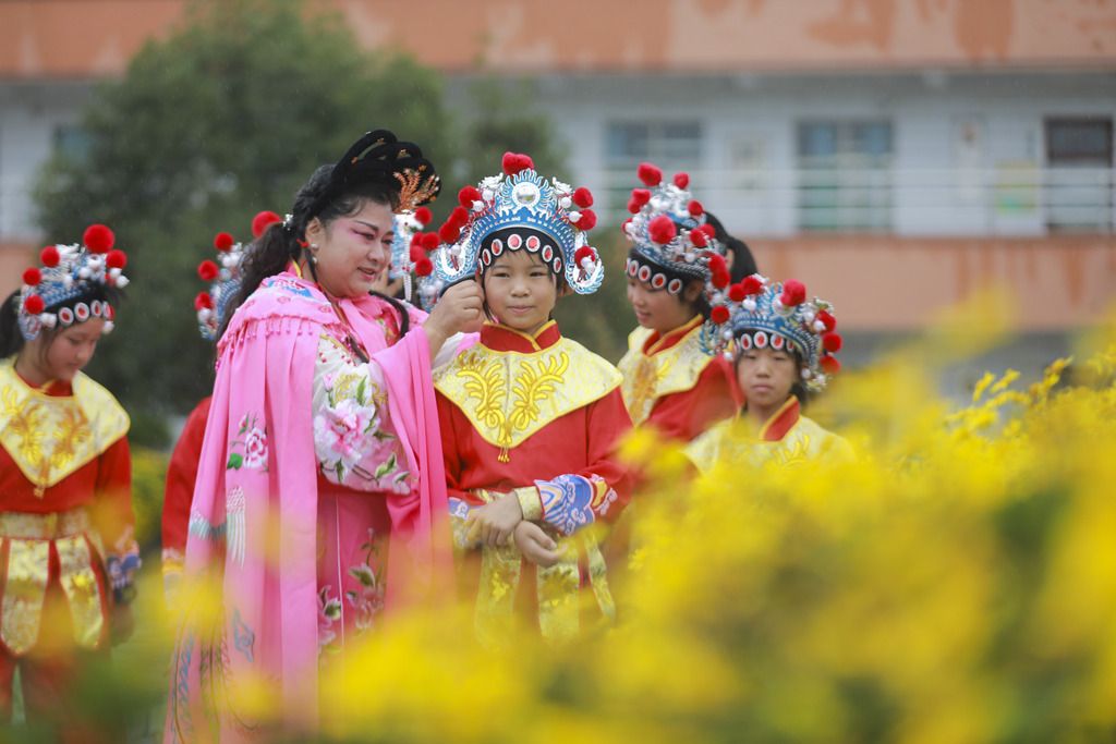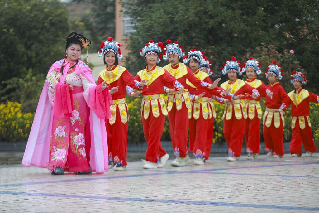 2024年9月30日,贵州省黔西市莲城街道天坪小学学生,课间在传承人的引导下,穿戏服,进行文琴戏表演,感受非遗文化的魅力。