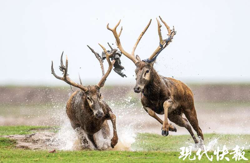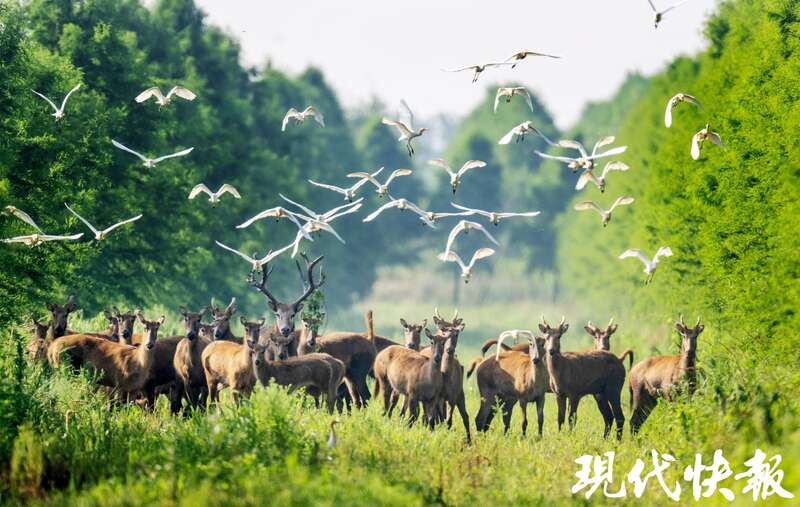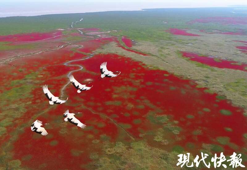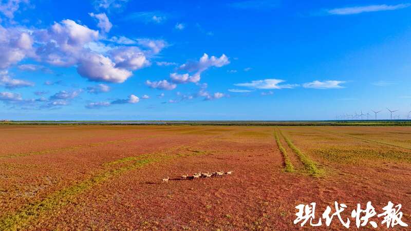 在东台条子泥湿地,盐蒿滩火红一片,美不胜收。野生麋鹿在“红地毯”上觅食嬉戏,不远处的候鸟展翅翱翔,构成了一幅充满生机野趣的自然画作。