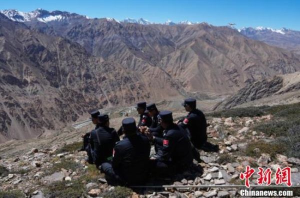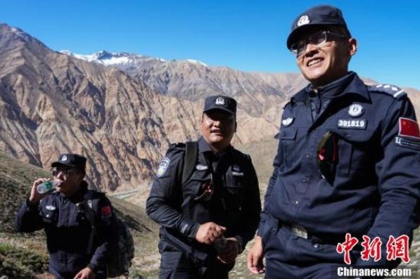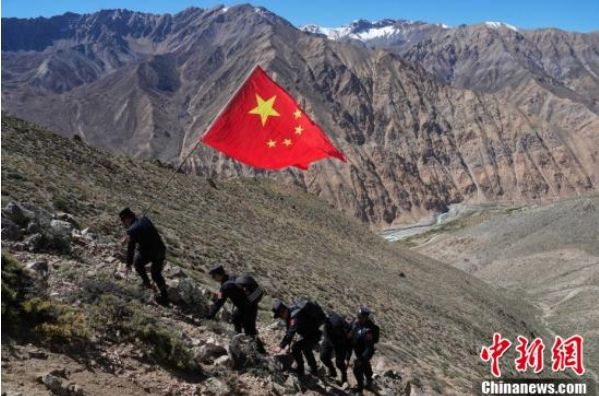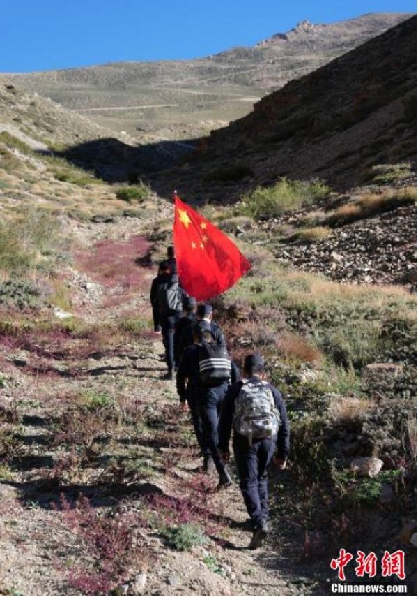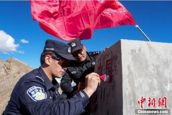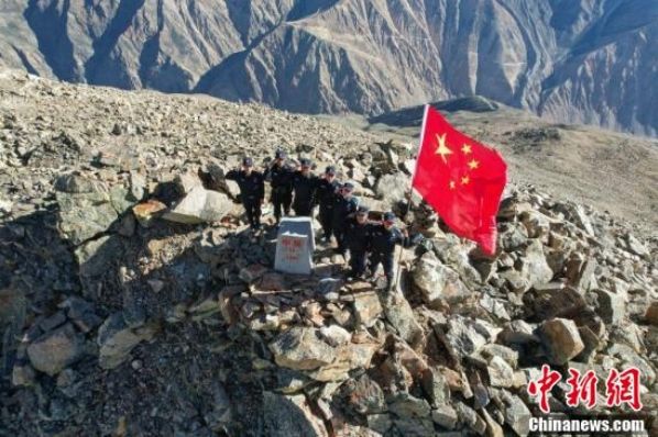 10月1日,国庆节当天,西藏普兰出入境边防检查站移民管理警察组成巡逻力量,前往中国尼泊尔第11号界桩巡逻,并为褪色界桩重新涂漆。该界桩海拔5204米,距执勤点直线距离约10公里,当地平均每月开展一到两次巡逻,巡逻一个来回约11个小时左右。图为巡逻队成员江峰、朗加多吉、尼玛国杰、王克举、杜栋进、洛桑、格热(从左至右)在中国尼泊尔第11号界桩留影。(无人机照片)