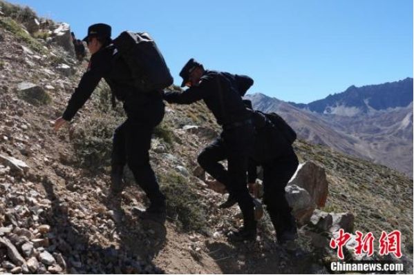 移民管理警察前往中国尼泊尔第11号界桩巡逻。