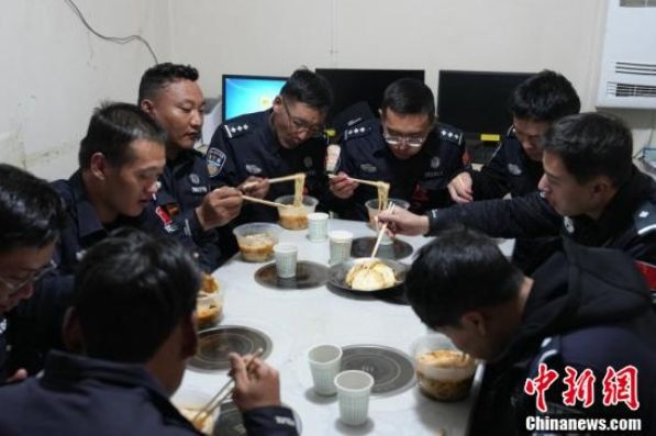 10月2日凌晨,巡逻队成员在完成巡逻返回执勤点后围坐享用简餐。