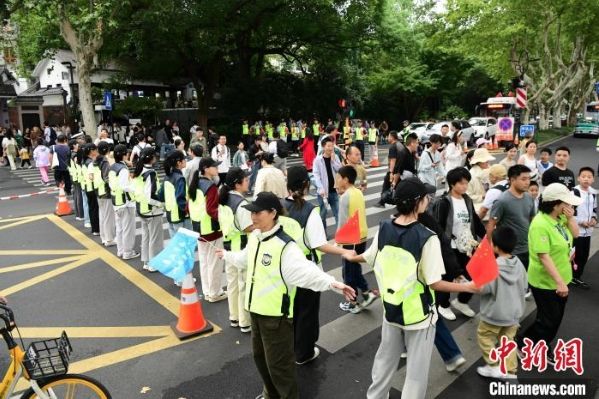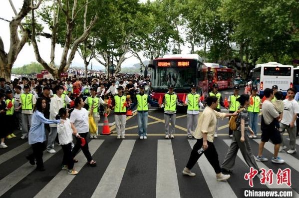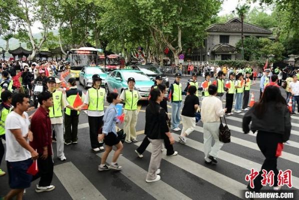 国庆期间,杭州西湖断桥旁再现由50名义警组成的“人墙”。这些志愿者在高峰时段,手拉手形成一道坚固的安全屏障,有效引导人流、车流,防止拥堵与事故的发生,成为节日里一道亮丽的风景线。冯少骏 摄