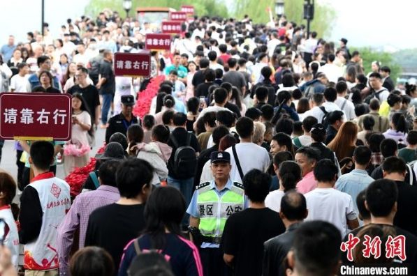 10月1日,杭州西湖断桥上游人如织。国庆期间,杭州西湖断桥旁再现由50名义警组成的“人墙”。这些志愿者在高峰时段,手拉手形成一道坚固的安全屏障,有效引导人流、车流,防止拥堵与事故的发生,成为节日里一道亮丽的风景线。冯少骏 摄