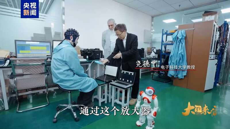 电子科技大学教授 尧德中:这套系统是通过电极帽采集大脑信号,传递到我们自己研发的放大器。通过放大器,信号再传递到电脑上,电脑经过处理过后就可以控制机器人运动。在这个过程中,残疾人的大脑也可以得到训练,实现一种康复的功能。