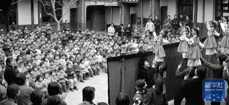 1972年4月27日,北京木偶剧团成员在市第一幼儿园为小朋友们演出。新华社发