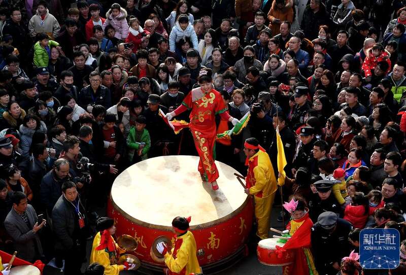 2018年3月2日,一支锣鼓队在河南浚县古庙会上表演。新华社记者 李安 摄
