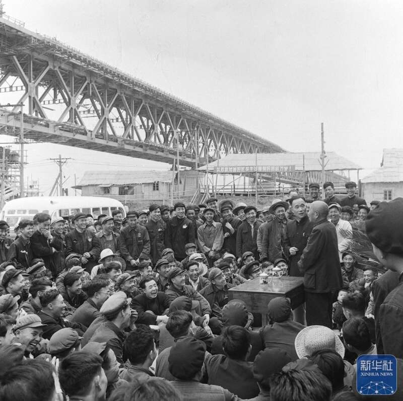 1957年4月,著名相声演员侯宝林、郭启儒于武汉长江大桥合龙前夕,在工地向工人们作慰问演出。新华社发