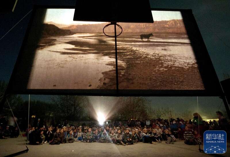 2011年4月15日,在新疆和田墨玉县沙依巴格乡巴格达提村的村委会大院里,村民们席地而坐观看电影。新华社记者 王菲 摄