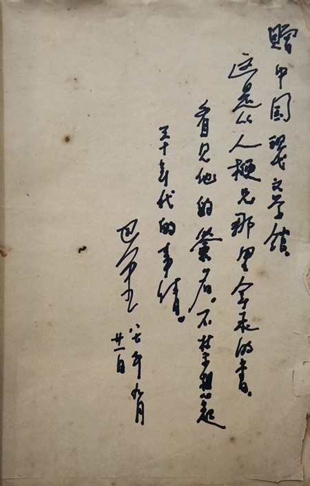 巴金在晚年整理藏书的同时,阅书忆过往成为重要的闲暇时光。对于藏书感情深厚,对于那些即将离开的书,他常常不舍,几经挽留。如1996年4月14日下午,只见巴老在家人的帮助下,缓缓地翻看着这批即将与他告别的书,他一页一页地浏览着,在被捐的这批书中有1900年的俄文版果戈理的《死魂灵》(豪华版编号发行,编号为No29)。还有一套是从旧书店购得、被巴老尊称为他的启蒙老师卢梭的法文版《忏悔录》,这本陈旧的豪华版本扉页上面留有巴老早年的朋友、诗人梁宗岱在1926年给邵洵美的亲笔题记。