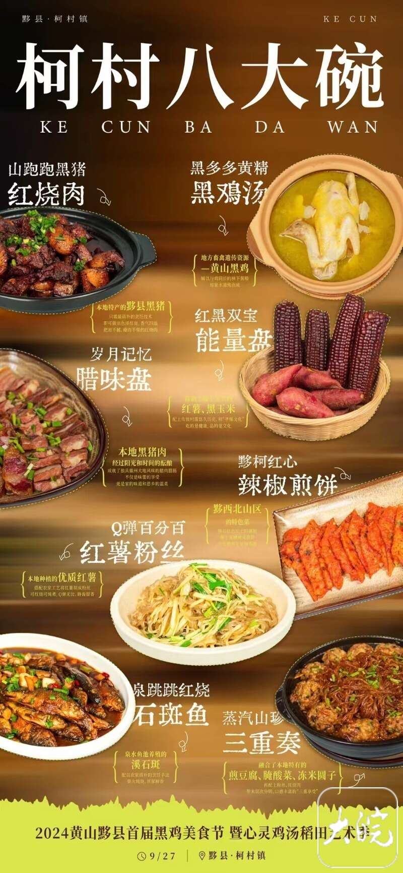 “柯村八大碗”则是柯村的另一个美食新品牌,“八大碗”是由柯村镇八个村子推选出的当地最具代表性的特色菜的组合。9月27日,2024黄山黟县首届黑鸡美食节暨心灵鸡汤稻田装置盆地艺术季在柯村启动,“柯村八大碗”正式对外发布。黑鸡汤、石斑鱼、红烧黑猪肉、腊味拼盘、辣椒煎饼、红薯粉丝……一道道烧了几十年的菜式因为有了新名字而走上了“品牌化”的道路。新式菜名包装下的柯村传统味道,不仅被推上游客餐桌,更被推上了互联网,成了远近闻名的“网红套餐”。据当地厨师说,最近来到柯村的游客都指名要吃“八大碗”。