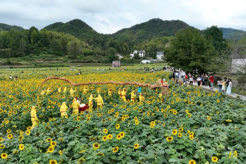 国庆假期,黄山市徽州区潜口镇落蜀源村游人如织,热闹非凡。成片的向日葵在这个千年古村争相开放,金黄的花瓣簇拥着沉甸甸的油籽,展现出一派丰收的大好景象。游客们在葵花基地打卡点前排起长队,争相与美丽的花海拍照。