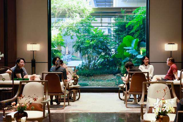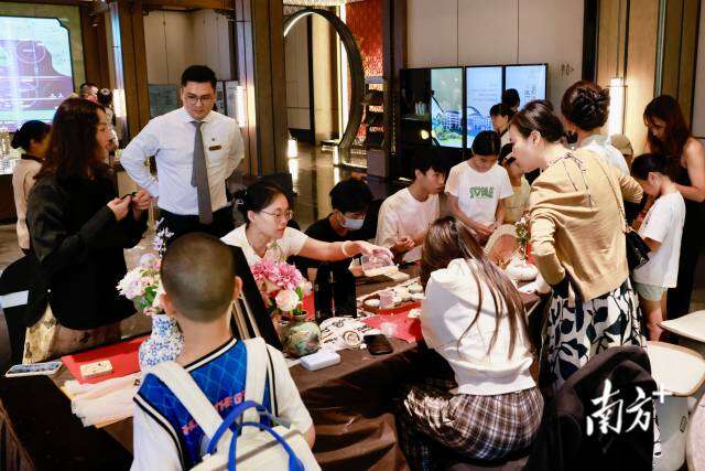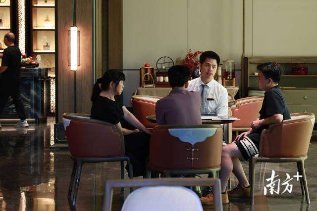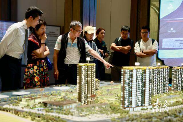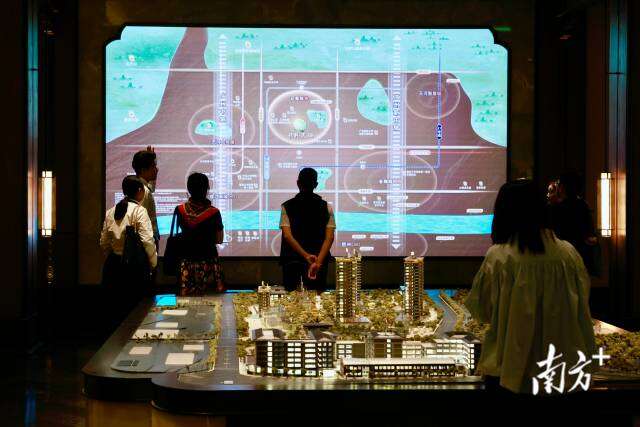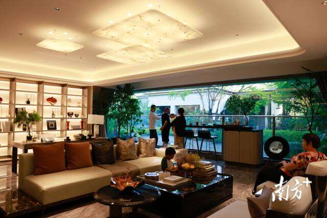 10月4日下午,南方+记者在广州天河区保利天瑞楼盘营销中心看到,楼房沙盘、洽谈区及样板间人潮涌动,工作人员带着看房者穿梭其中,销售人员的电话及信息不断,停车场停满车辆,还不时看到有车辆进来。