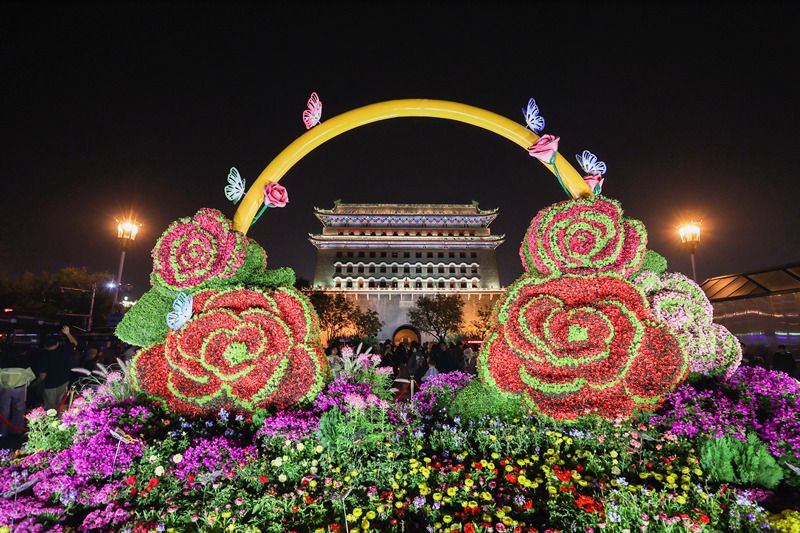 2024年10月6日,北京,游客在北京前门大街和正阳门箭楼前参观游览。