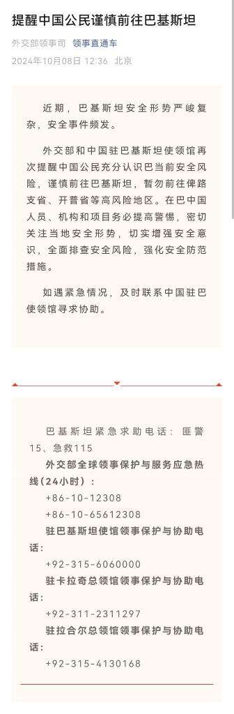 据外交部“领事直通车”微信公众号10月8日消息,近期,巴基斯坦安全形势严峻复杂,安全事件频发。