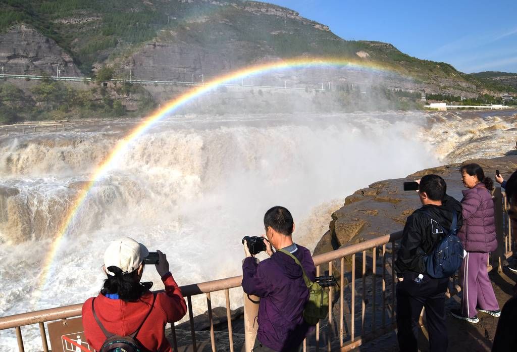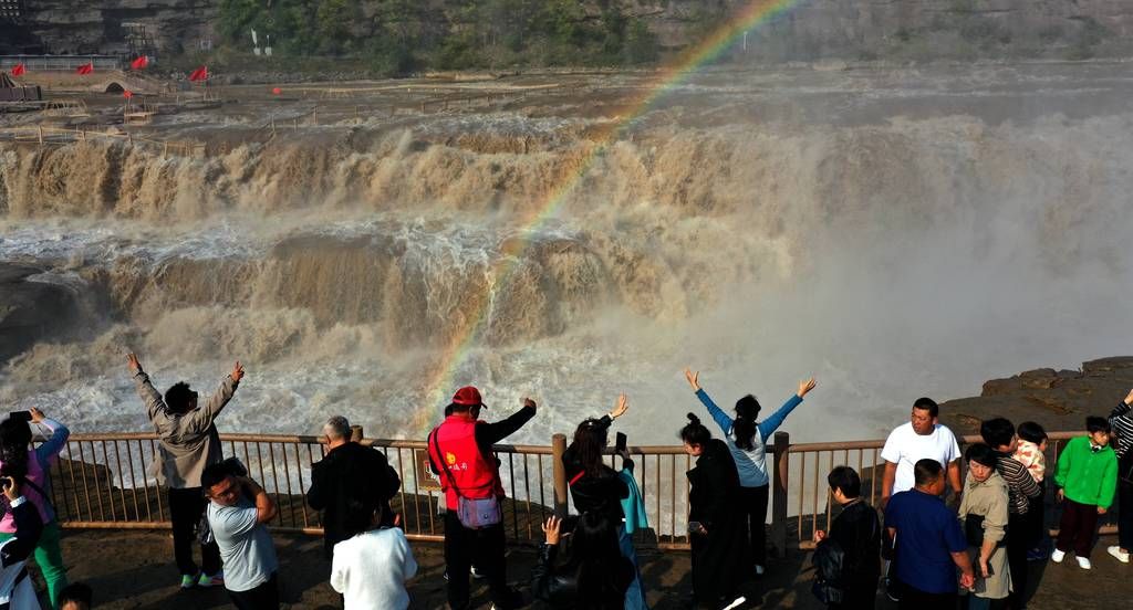 2024年10月8日,山西临汾,游客在吉县黄河壶口瀑布欣赏“彩虹桥”景观。近日,受上游降雨和水库调节放水影响,黄河壶口瀑布水量增大,水势浩荡,飞溅的水雾在阳光的照射下,形成彩虹桥景观,吸引了众多游客。