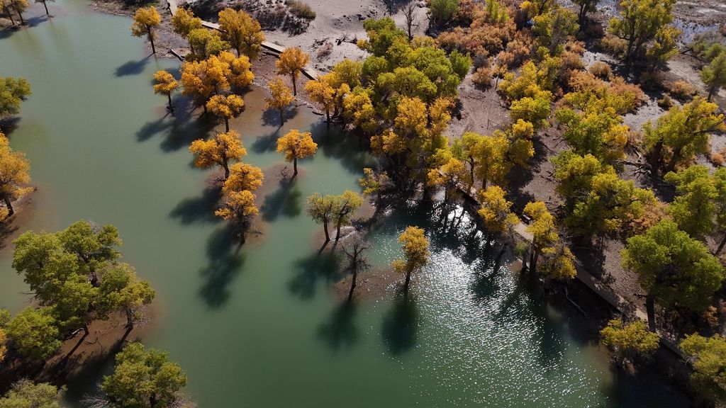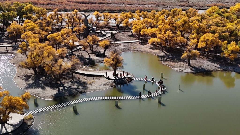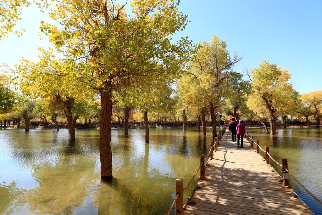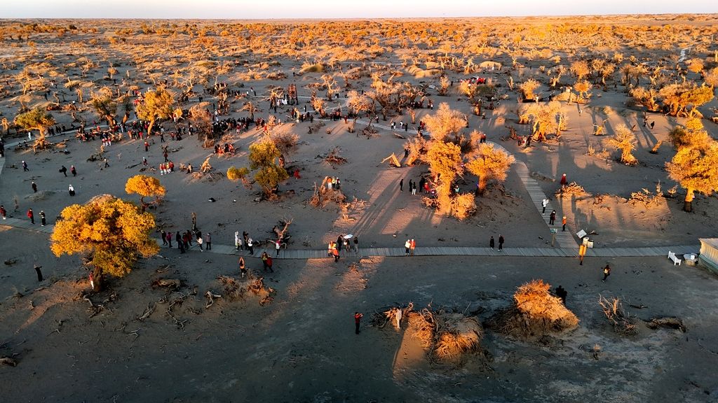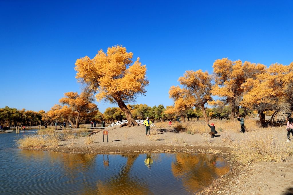 目前全世界仅存的三大胡杨林之一。目前黄色叶片比例达到80%以上,进入最佳观赏期。各景点内的胡杨林一片金黄、耀眼夺目,各地游客纷至沓来,领略胡杨秋色的美丽景色。