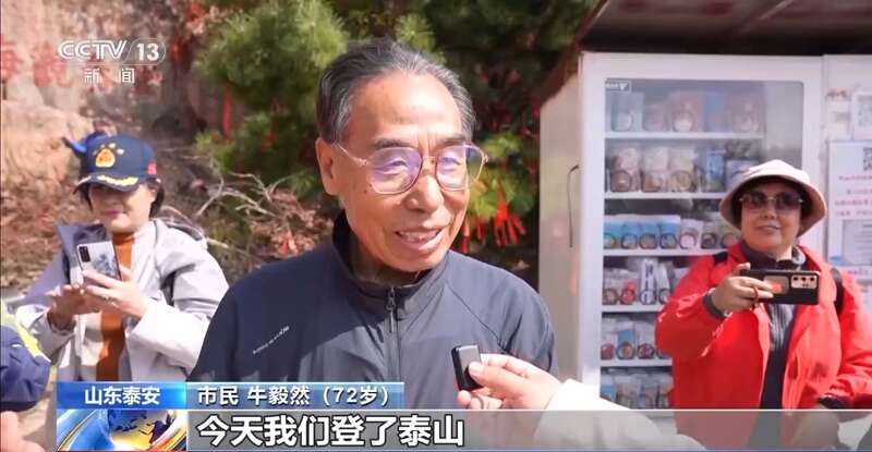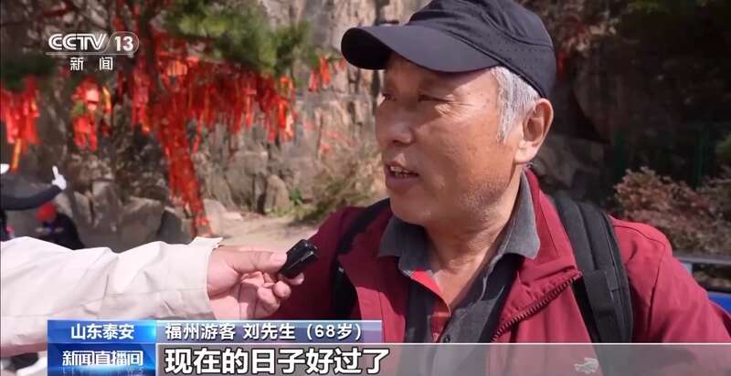 今天预计泰山共迎来游客2万人左右,跟平时最大的一个不同就是人员的比例结构。平时老年游客估计只占了不到10%,而今天根据预测,老年游客可能会达到20%~25%。从我们的镜头中也可以看到,今天大多数都是老年游客。而泰山,对60周岁以上的老年人是完全免票的。
