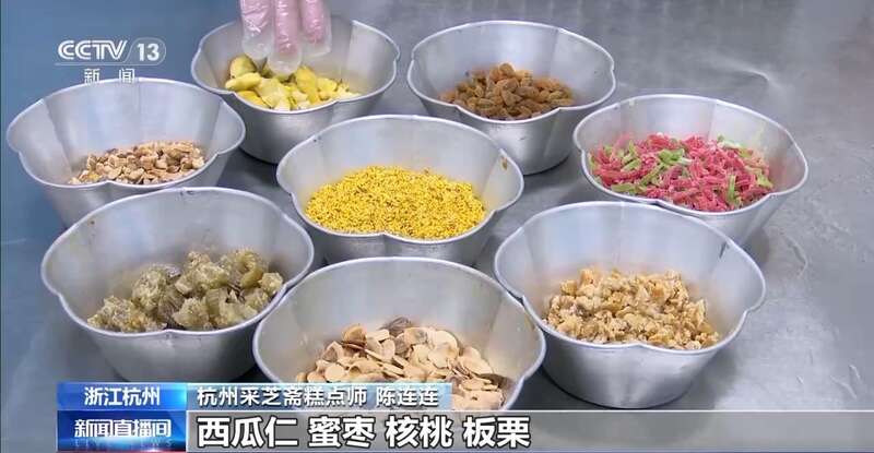杭州采芝斋糕点师陈连连:葡萄干、红绿丝、橘丁、西瓜仁、蜜枣、核桃、板栗,还有杭州最有特色的桂花干。