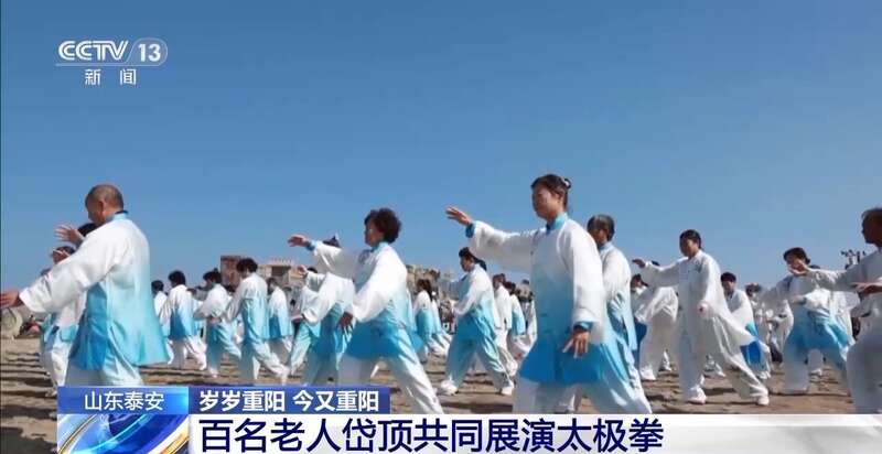 重阳节是传统的敬老节,今天有百名老人来到这里共打东岳太极拳。东岳太极拳动作特点非常舒展大气,动作很慢,但是却是一个全身运动,适合老年人来学习锻炼。