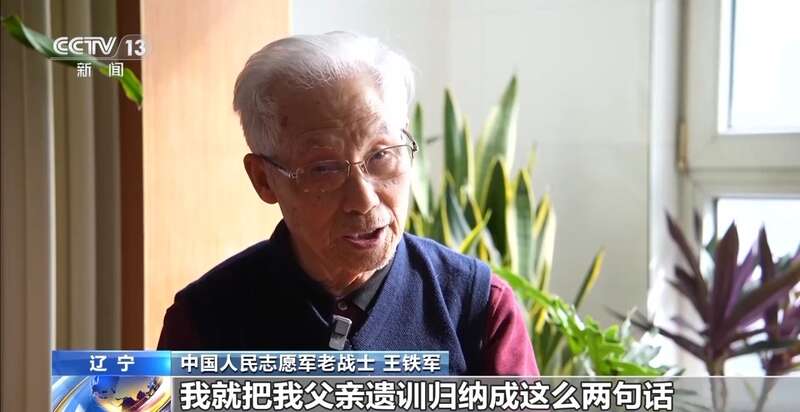 中国人民志愿军老战士 王铁军:一句话叫忠信明德承古训,第二句话叫勤诚仁义继家风。我就把我父亲遗训归纳成这么两句话,人生要有一个很好的品德,这应当说是第一位的。健康是个躯壳,品德是个灵魂,首先是要勤,要诚,这两个字是最关键的,不能够懒惰,不能够懈怠,不能够虚伪,做人就要有这样的好的品质。