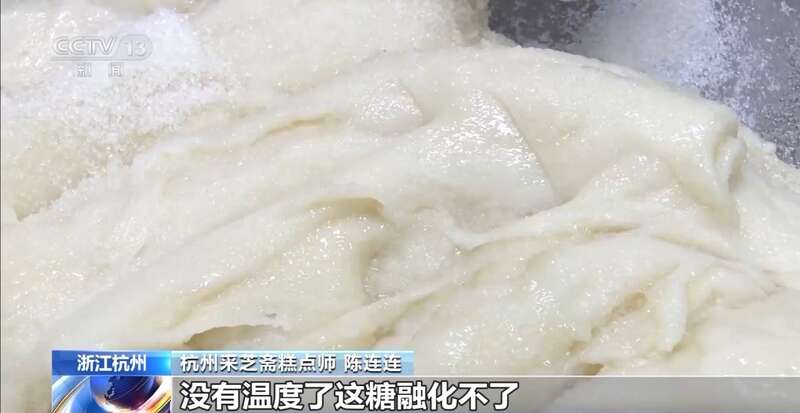 杭州采芝斋糕点师陈连连:蒸好的糯米和糖完全混合,搅拌在一起。拌的时候还一定要热拌,没有温度了这糖融化不了。
