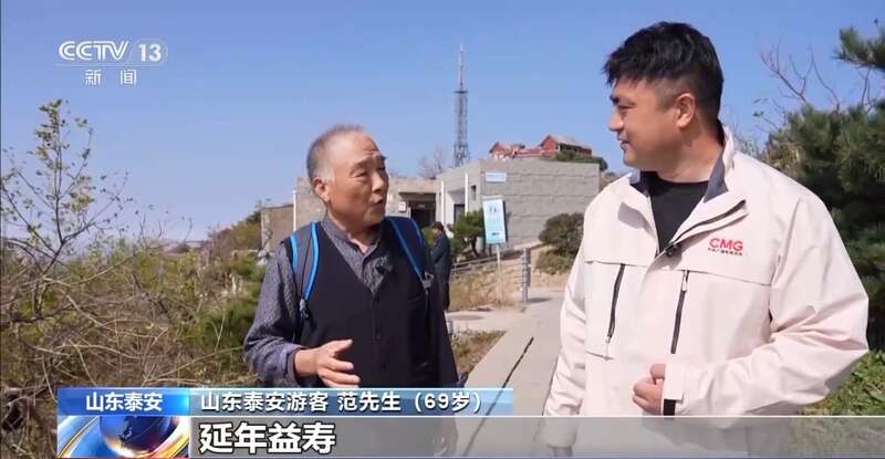 山东泰安游客 范先生(69岁):爬泰山健体强魄养精神,延年益寿。我今年爬了6次泰山,体重由原来165斤减到现在142斤,我儿媳妇非常赞赏,说你回去继续发扬,不能再反弹。