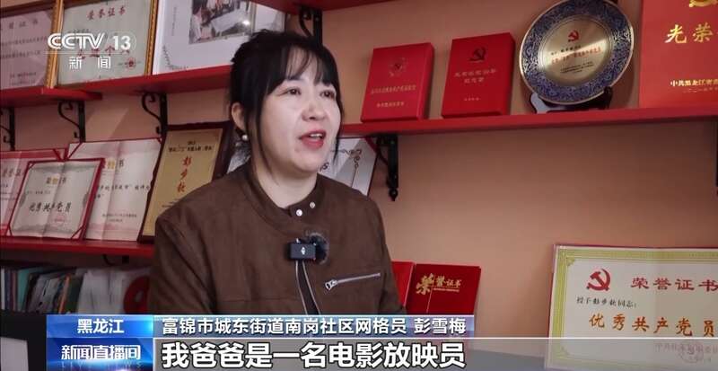 黑龙江富锦市城东街道南岗社区网格员 彭雪梅:我爸爸是一名电影放映员。从事他的工作50年里,天天在别人都已经在睡梦当中,他还在路上,特别是他一个人在支影幕,抬这些设备,都非常地劳累。但是他始终坚持,所以我就觉得我爸爸的这种精神无时无刻不在鼓舞着我。