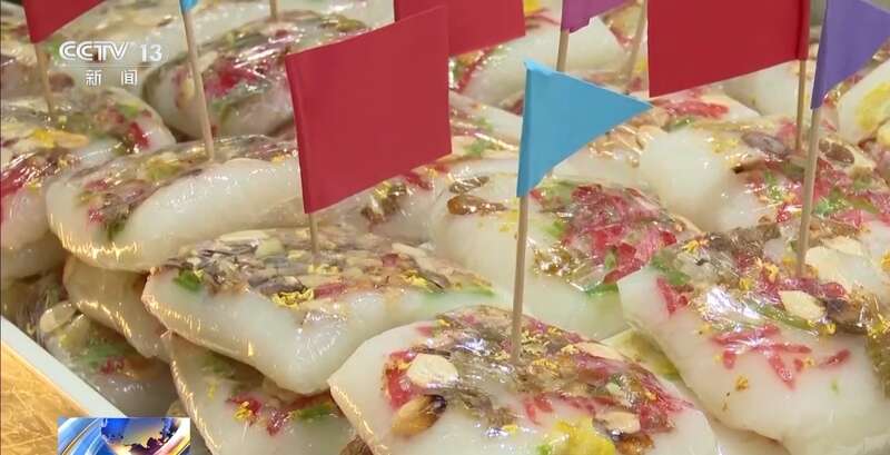陈师傅告诉记者,最后还要在重阳糕上,插上一面面五颜六色的小旗,寓意“登高”,祝福吃糕之人“步步登高”。