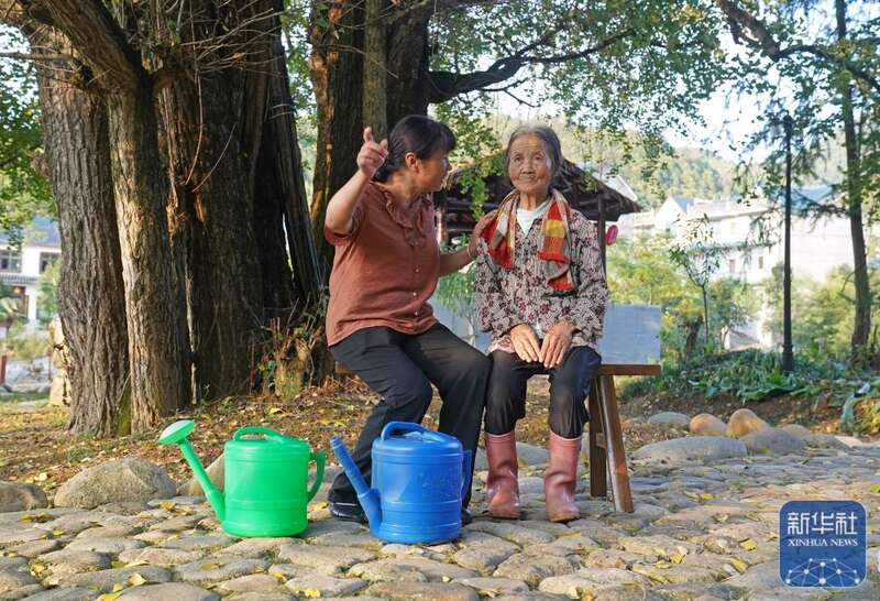 沿着盘山公路上行,汽车开进了沽溪村。群山环抱着整齐的新楼房,鲜花点缀在整洁的村道两旁,村民在院子里晾晒收获的稻谷。