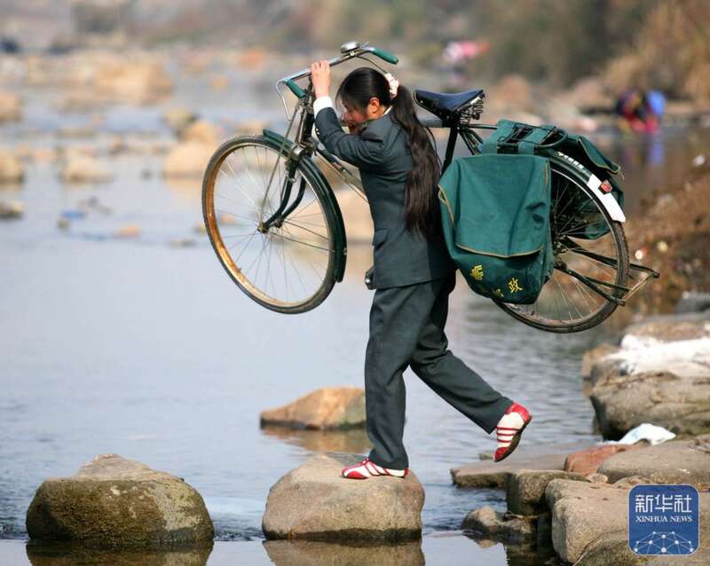 上面这张照片中,邮递员罗细英从陈坊乡出发前往锁子桥村(自然村)送信件和报刊,为了赶时间、抄近路,就扛着自行车过河。跟随采访的新华社记者在河边拍下了这张照片。如今,老照片拍摄地的小河沟上已建起了公路桥。