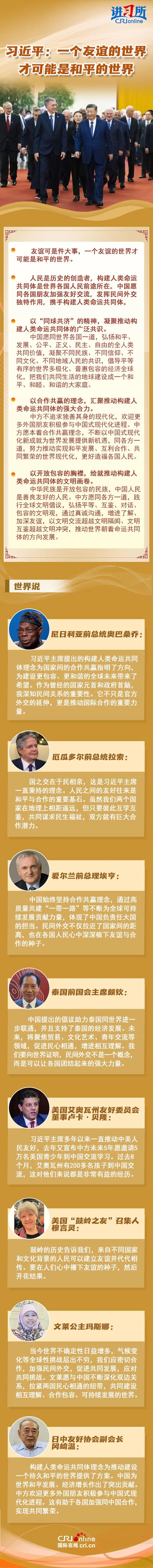 习近平主席在讲话中深刻阐释了新形势下发挥民间外交独特作用、深化中外民间友好、推动构建人类命运共同体的中国主张,强调中方愿同各国朋友一道,以友为桥、以心相交,不断深化中外民间友好,共同为我们的子孙后代建设一个更加美好的世界。