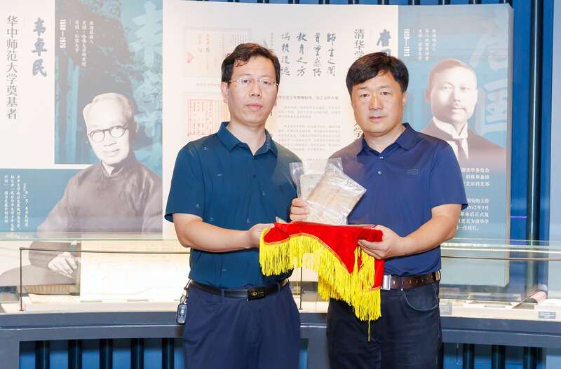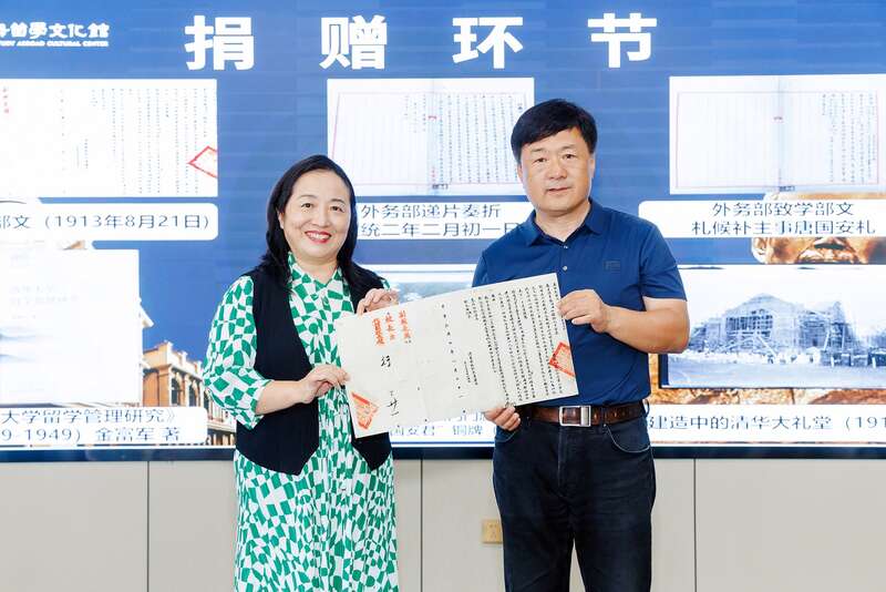 珠海历史名人研究学者李琛(左)向清华大学校史馆、档案馆捐赠唐国安及早期清华珍贵史料,清华大学档案馆科技与人物档案部主任李运峰(右)代表档案馆受捐。陈荷/摄