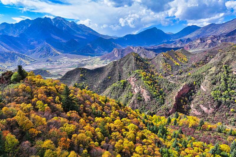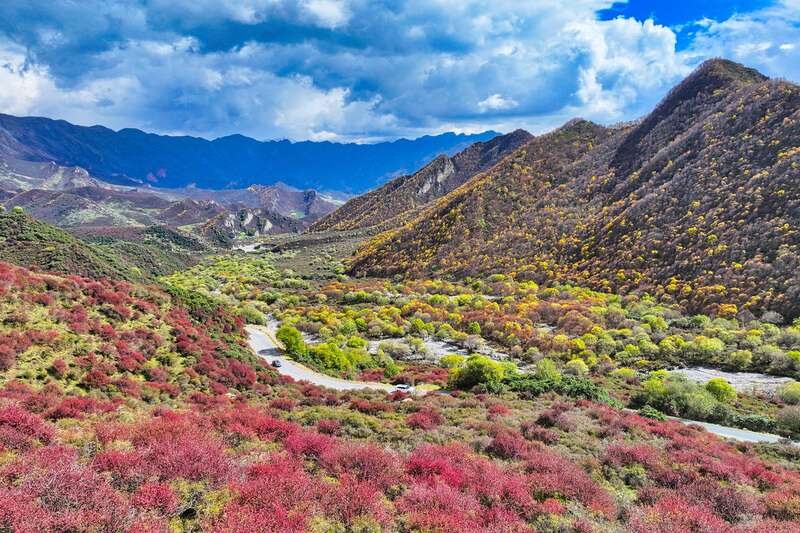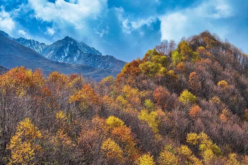 金秋十月,群加国家森林公园迎来了最美的景色。层云翻滚,雪山巍峨,高原风情是公园的底色。金黄的秋叶、殷红的灌木、墨绿的松柏,秋风拂过,每种颜色都各自跃动着生机,又一起组成一幅美不胜收的秋日画卷。
