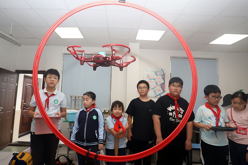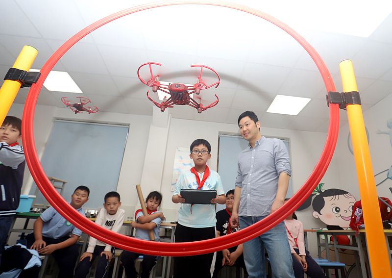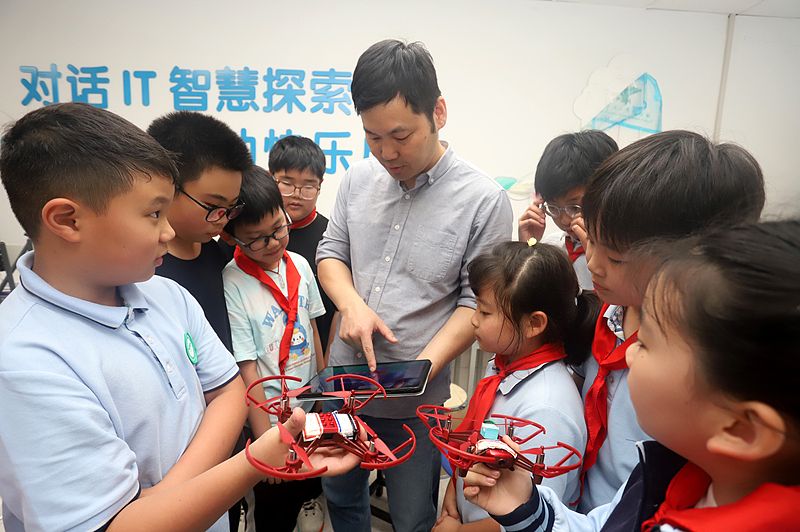 2024年10月14日,苏州市平江实验学校学生在校外科技老师辅导下专注地学习无人机操作和编程。