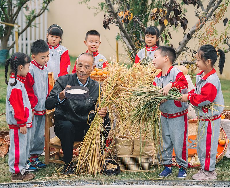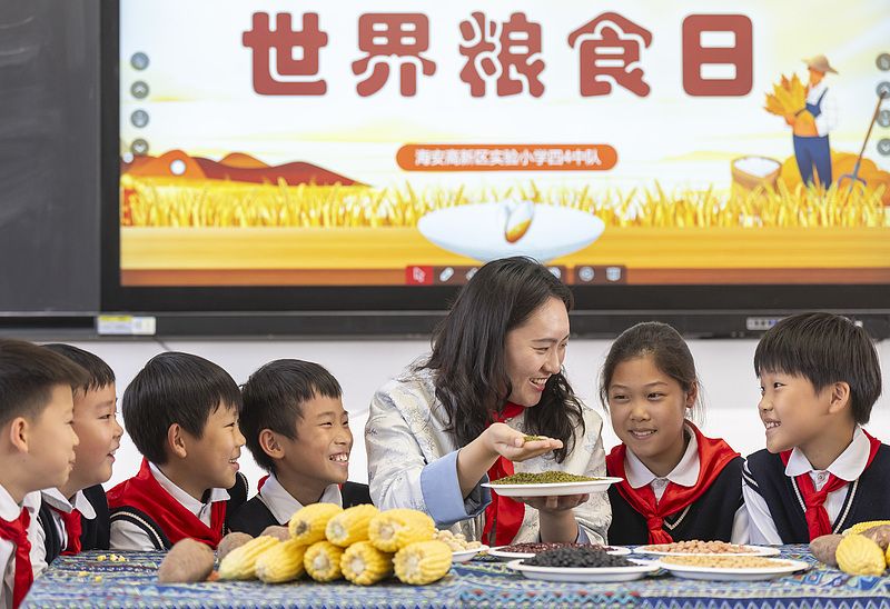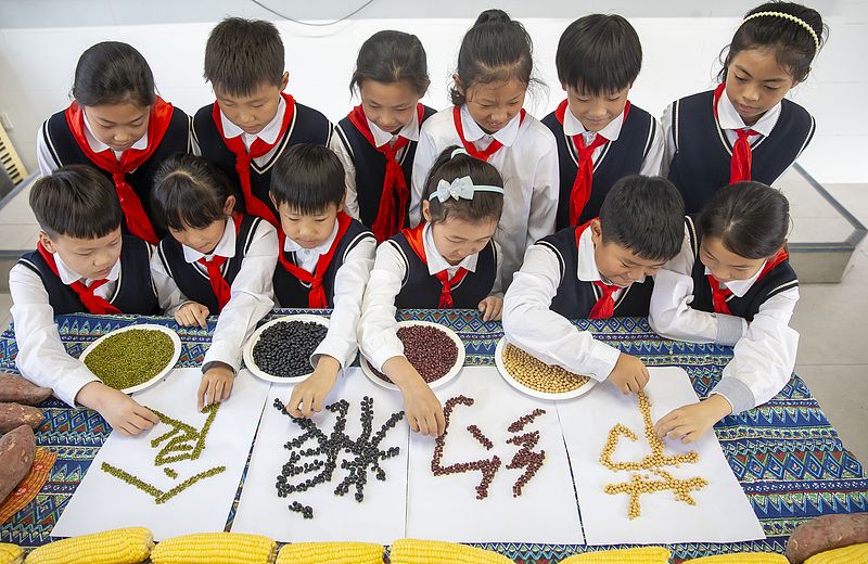 2024年10月14日,浙江省湖州市,长兴县泗安镇中心幼儿园开展“多彩活动迎爱粮”主题教育活动,孩子们通过辨识粮食,体会农事辛苦,提高爱惜粮食的意识,养成节约粮食的习惯。
