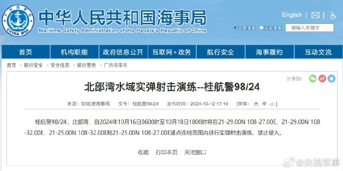 据中国海事局网站消息,防城港海事局发布航行警告,10月16日6时至10月18日18时,北部湾部分水域进行实弹射击,禁止驶入。