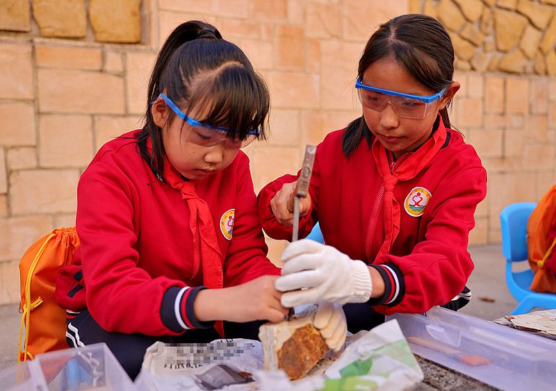 2024年10月15日,河北秦皇岛,海港区石岭小学学生体验开化石过程。