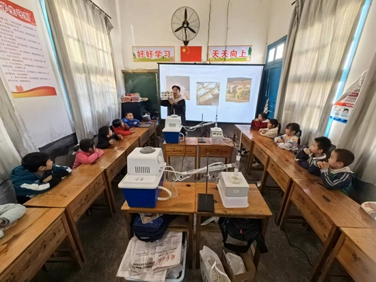 在江西婺源大鄣山乡篁田小学,一个村小只有1位老师和15名学生,当林奈实验室的工作人员抬着幕布、投影仪、显微镜、螺旋冷凝管和各种标本走进教室时,孩子们欢呼雀跃。他们学着提取植物精油,用显微镜观察微生物,听老师讲述鸟儿的故事,稀奇词语也为小朋友们打开了另一个世界的大门。