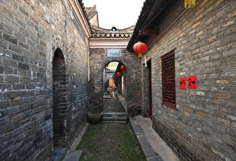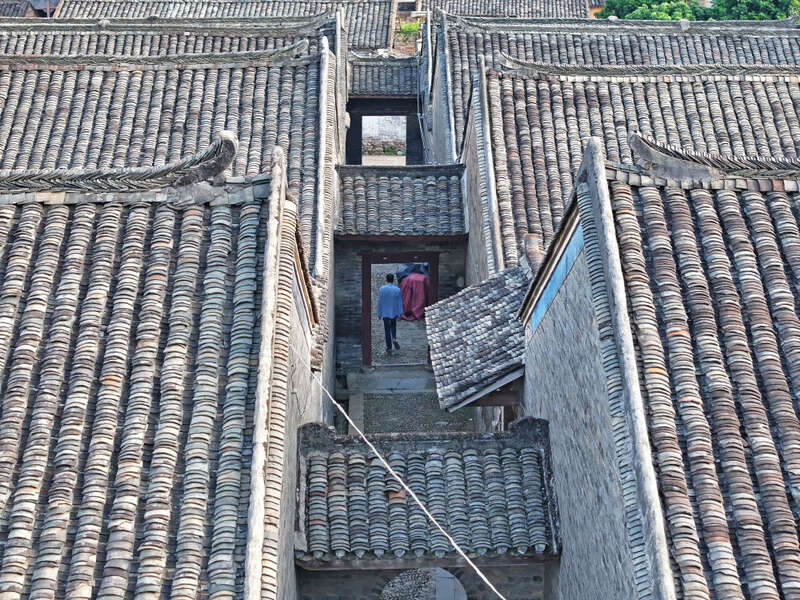村民行走在广西来宾市象州罗秀镇纳禄村的古巷中(10月9日摄,无人机照片)。