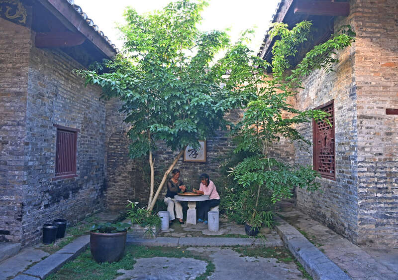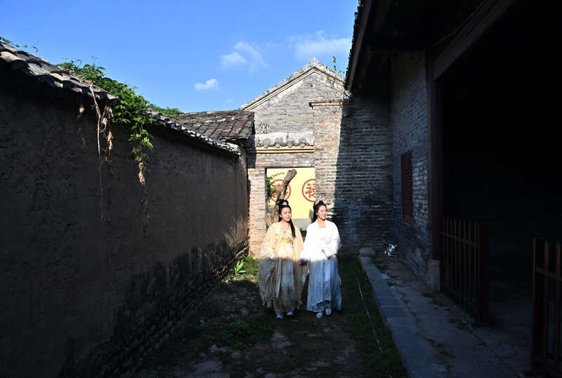 两名游客在广西来宾市象州罗秀镇纳禄村的古宅里翩翩起舞(10月10日摄)。