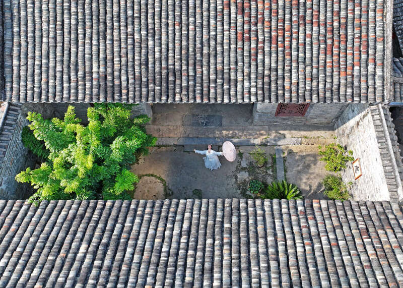 游客在广西来宾市象州罗秀镇纳禄村的古宅中翩翩起舞(10月10日摄,无人机照片)。