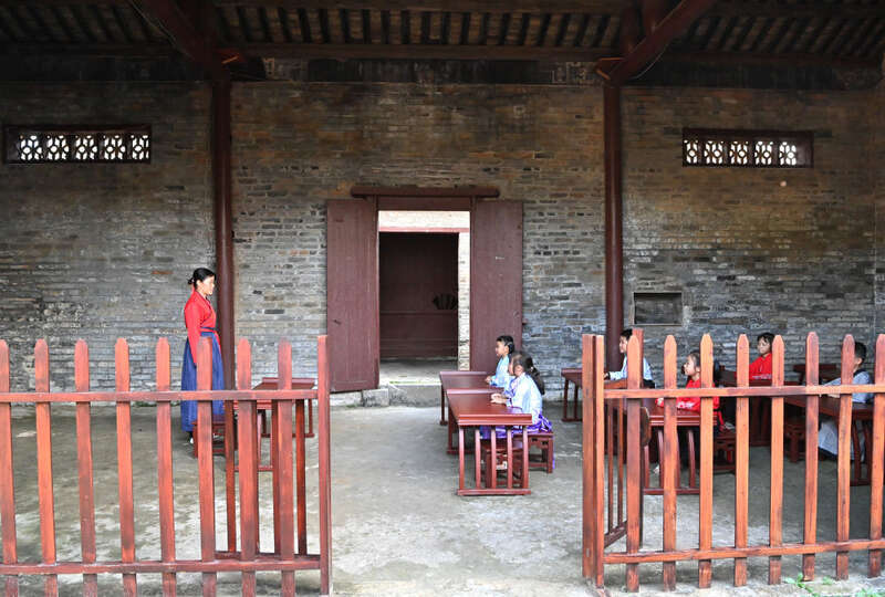 一名老师带着几名孩子在广西来宾市象州罗秀镇纳禄村的古学堂里学习(10月10日摄)。