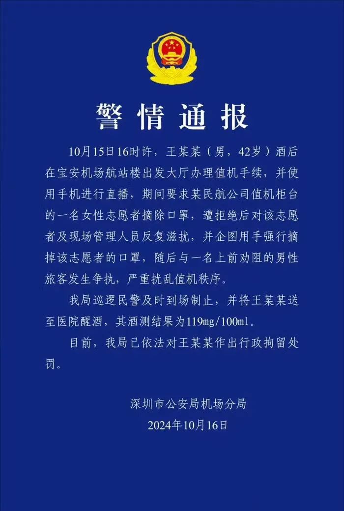 目前,深圳市公安局机场分局已依法对王某某作出行政拘留处罚。